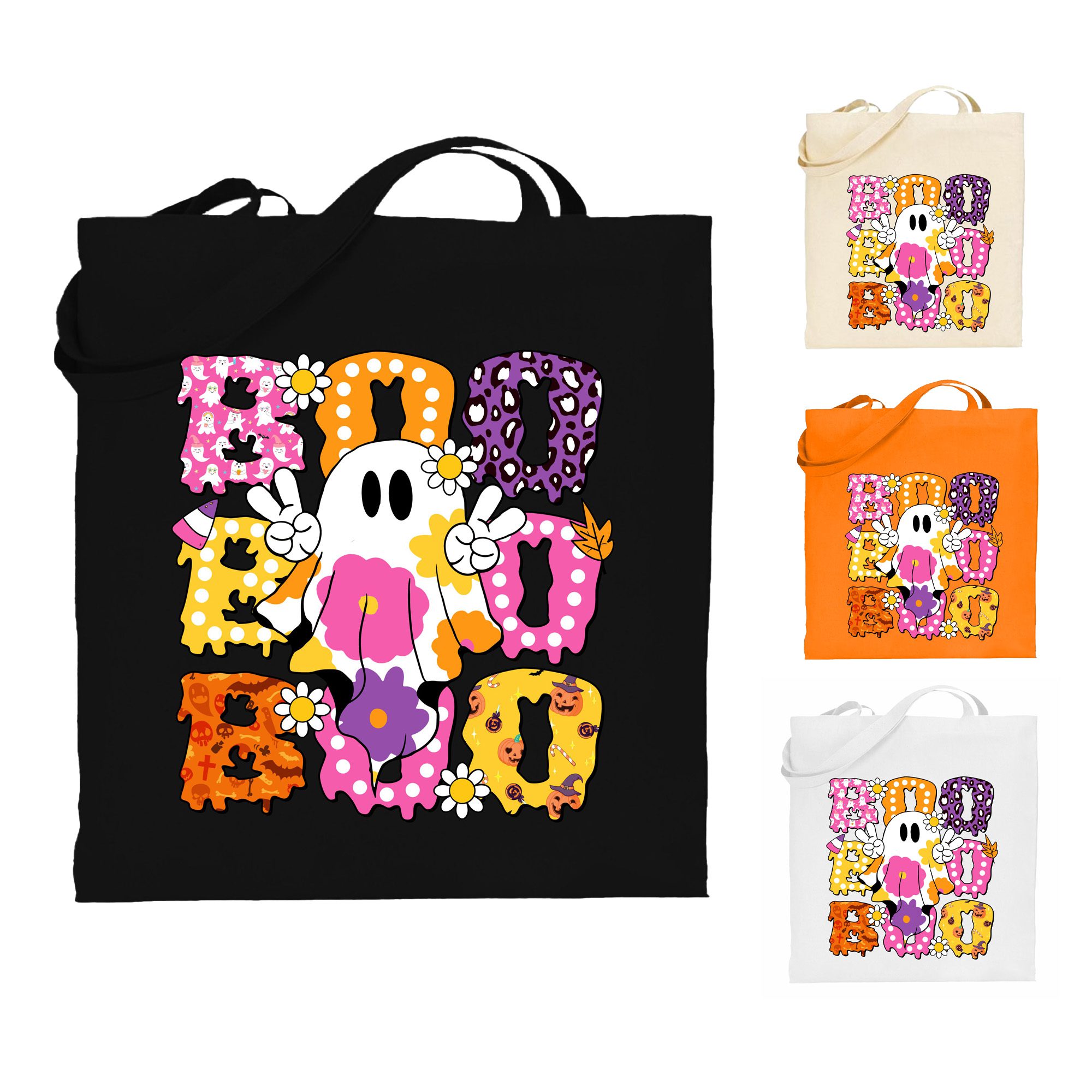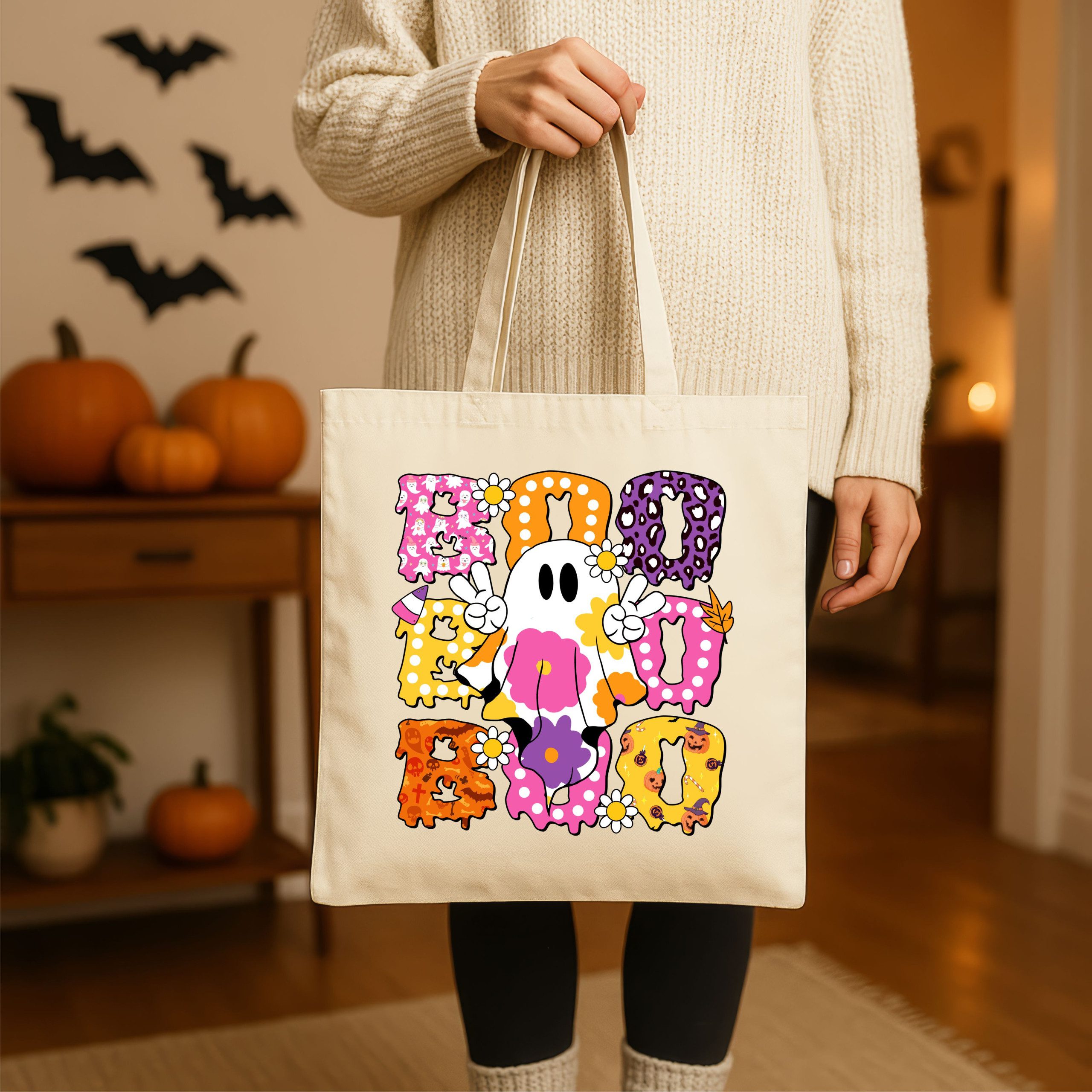 Halloween Tote Bag – Groovy BOO Ghost & Daisies – Retro Trick-or-Treat Bag
