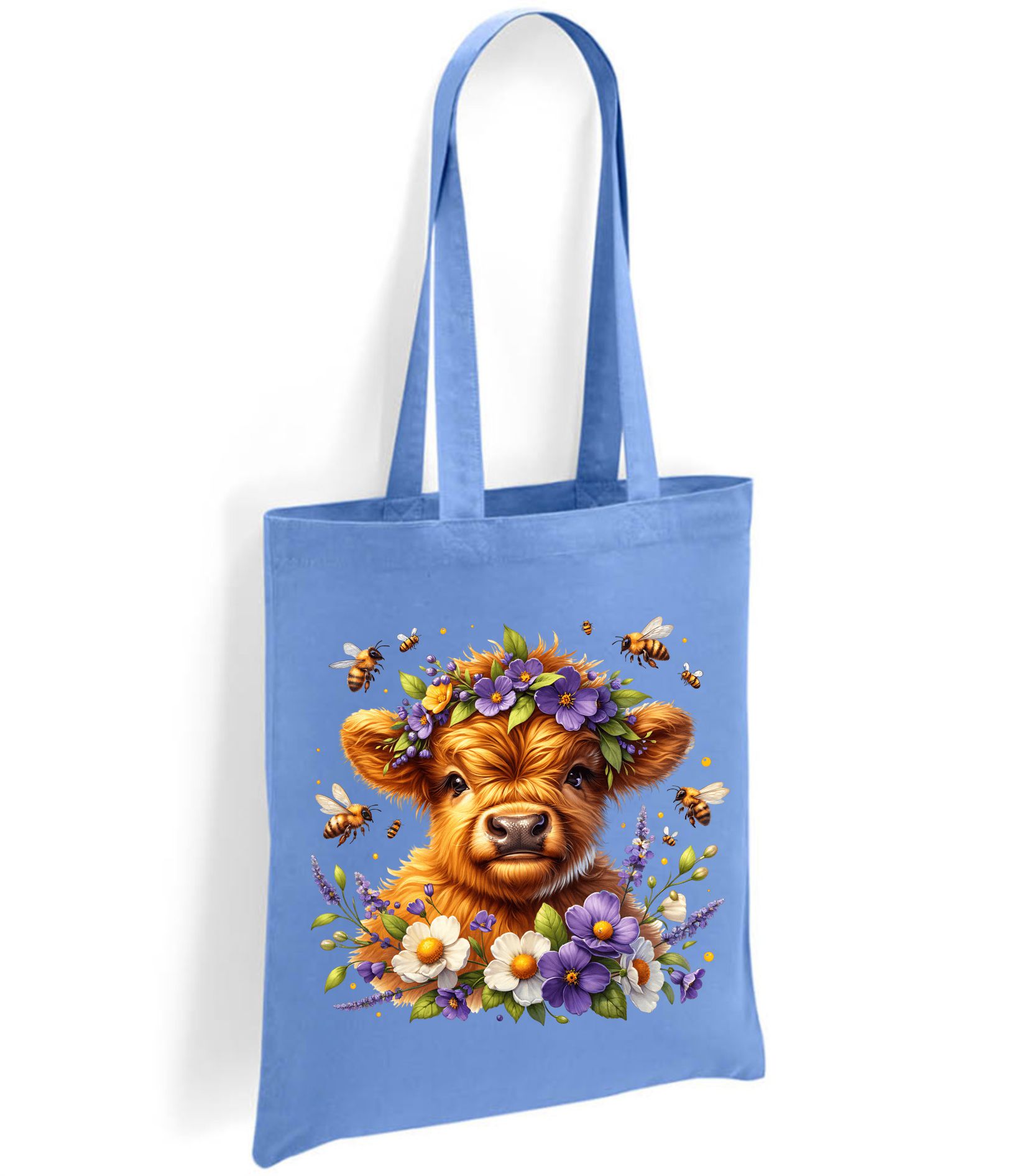 Highland Cow Tote Bag – Cute Floral Cow Design with Bees