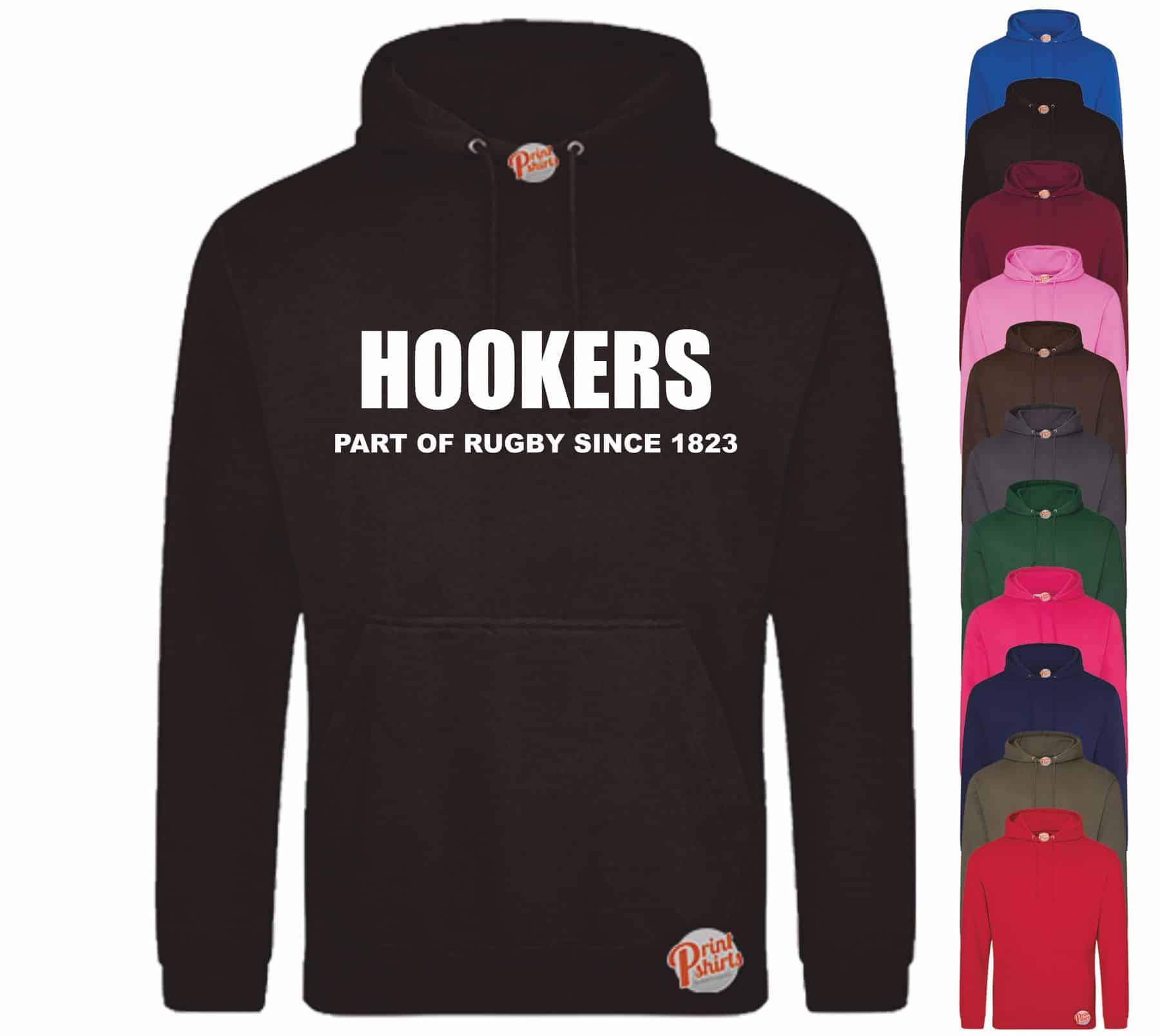 (Hoodie) Hookers – part of rugby since 1823! Take a look at this funny jumper ideal for those who are really into to the rugby life! Stick your gumshield in and let the good times roll! Hoodies for all men and women. A cheap and affordable price! Perfect for people of all ages. Available in multiple colours. Available in all years. Get your helmet on and tackle your opposition in a top to match! Whether it’s during training, down the park with your mates or even before a match this top is bound to make people smile! Get your very own “(Hoodie) Hookers – part of rugby since 1823” Printed jumper right this second!