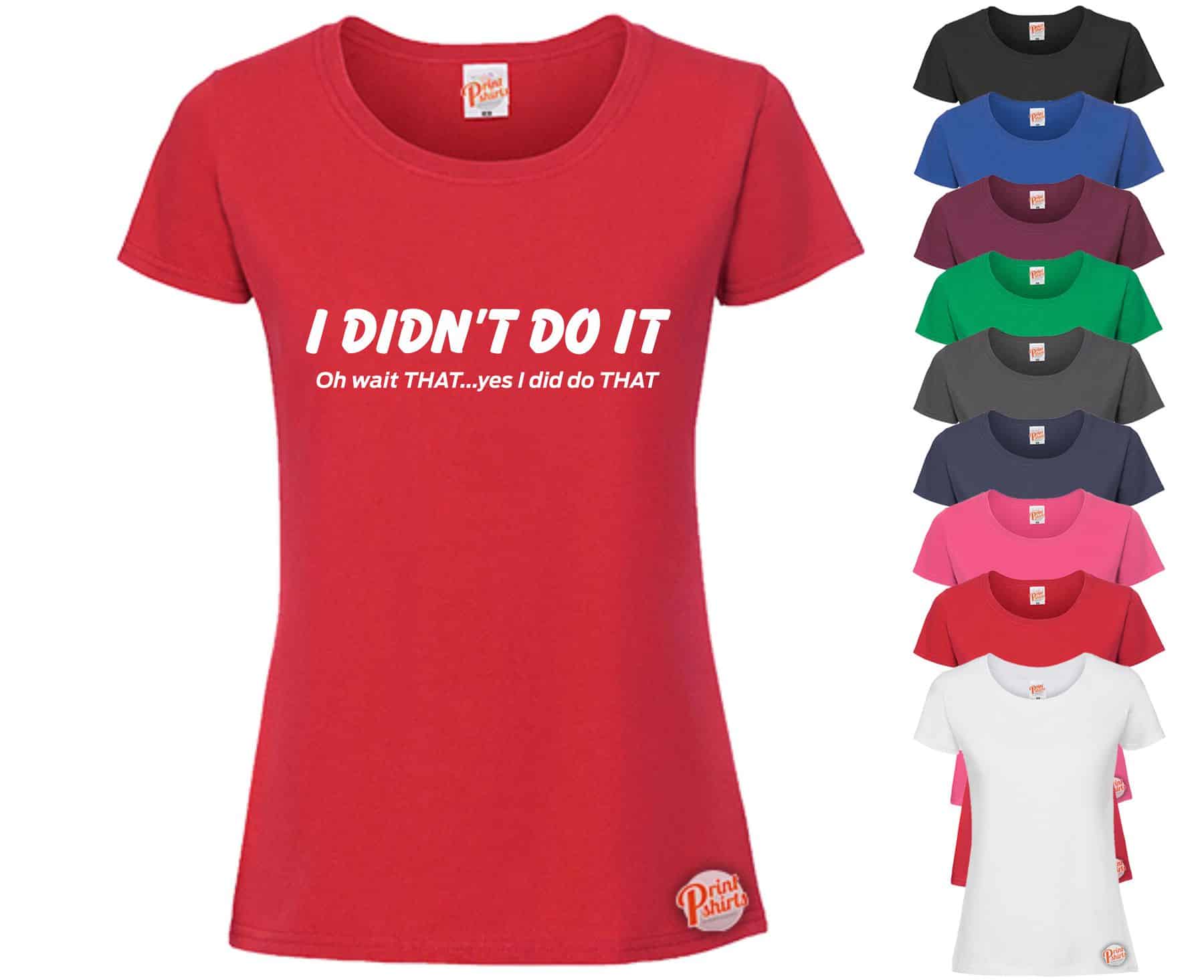 (Ladies) I didn’t do it, oh wait that yes I did do that! Take a look at this funny T-Shirt ideal for girls with a great sense of humour! Put on this hilarious and humorous printed top and let the good times roll! T-shirts for all women. A cheap and affordable price! Perfect for people of all ages. Available in multiple colours. Available in all years. Crack an silly joke or two, be greeted with mischievous giggles in a tee to match! Whether it’s at a family gathering, lunchtime at work, or just down the local pub with the lads, this tummy tickling styled top is bound to make people laugh out loud uncontrollably! Get your, “(Ladies) I didn’t do it, oh wait that yes I did do that!” Printed t-shirt now!