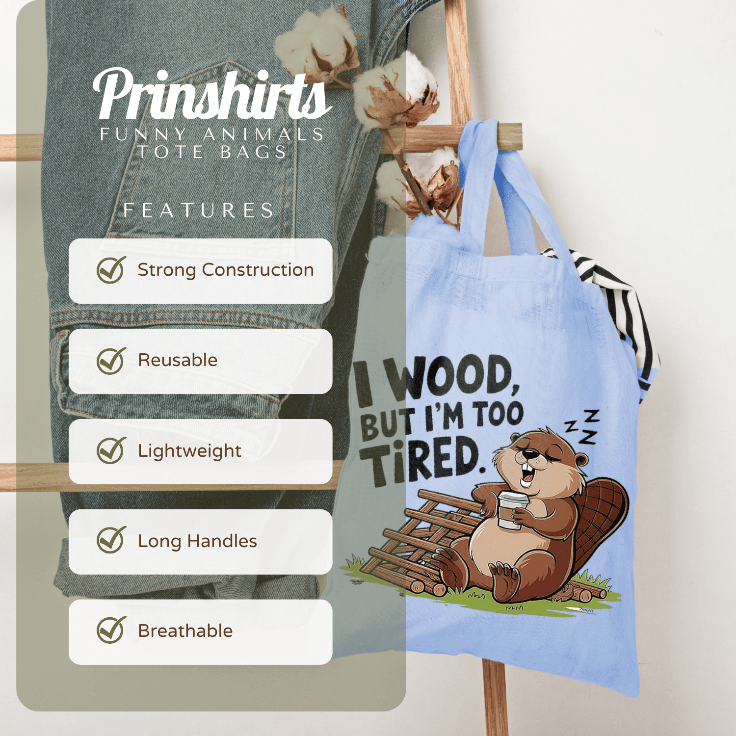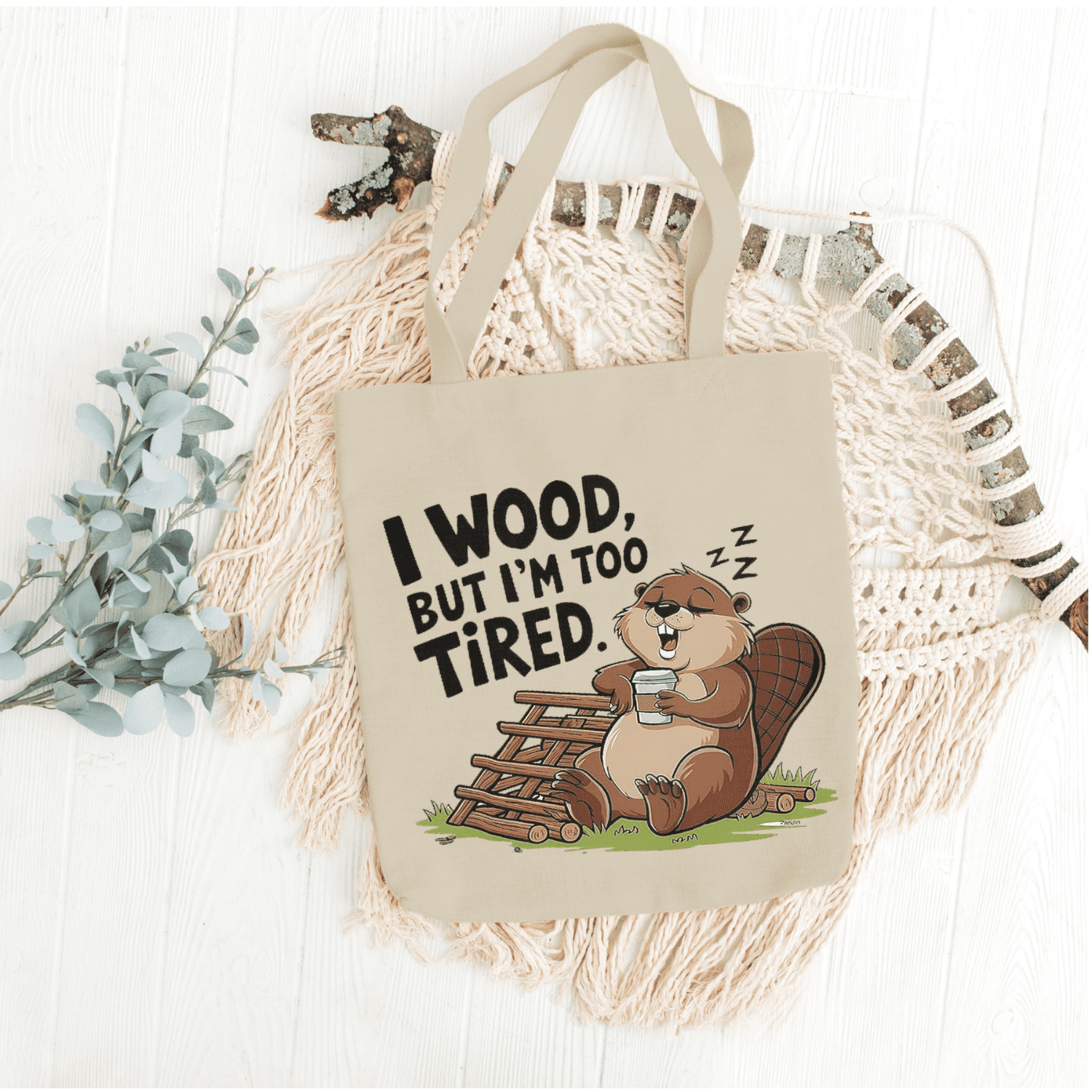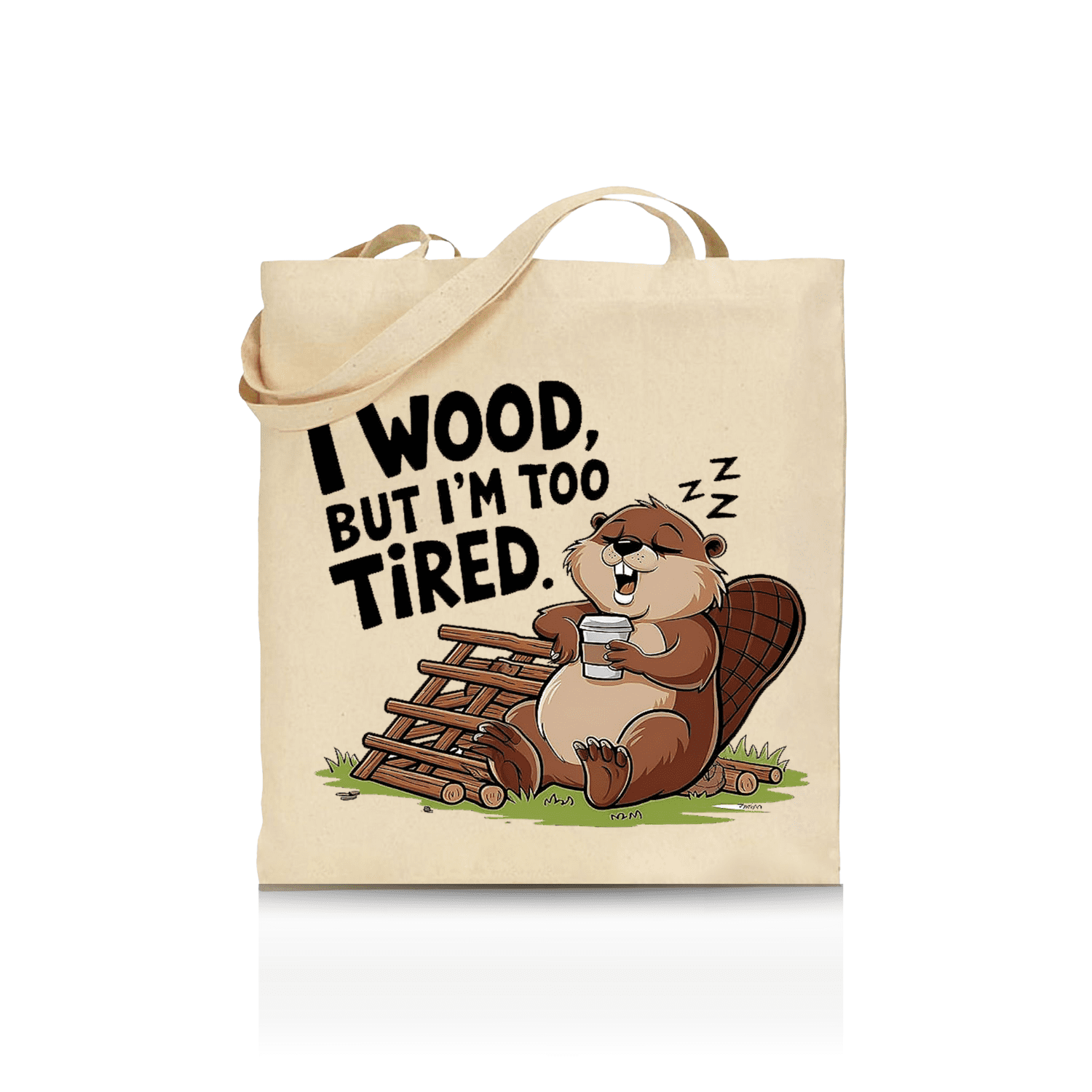 I Wood Too Tired Beaver Tote Bag – Funny Cartoon Animal Coffee Lover Graphic Bag for Summer, Beach, Work, School, Shopping & Everyday Use dependable everyday tote that lasts well beyond one outing. The bold animal artwork stands out, the cotton build is lightweight yet sturdy, and it folds flat into a drawer, glove box or hallway basket until the next adventure.