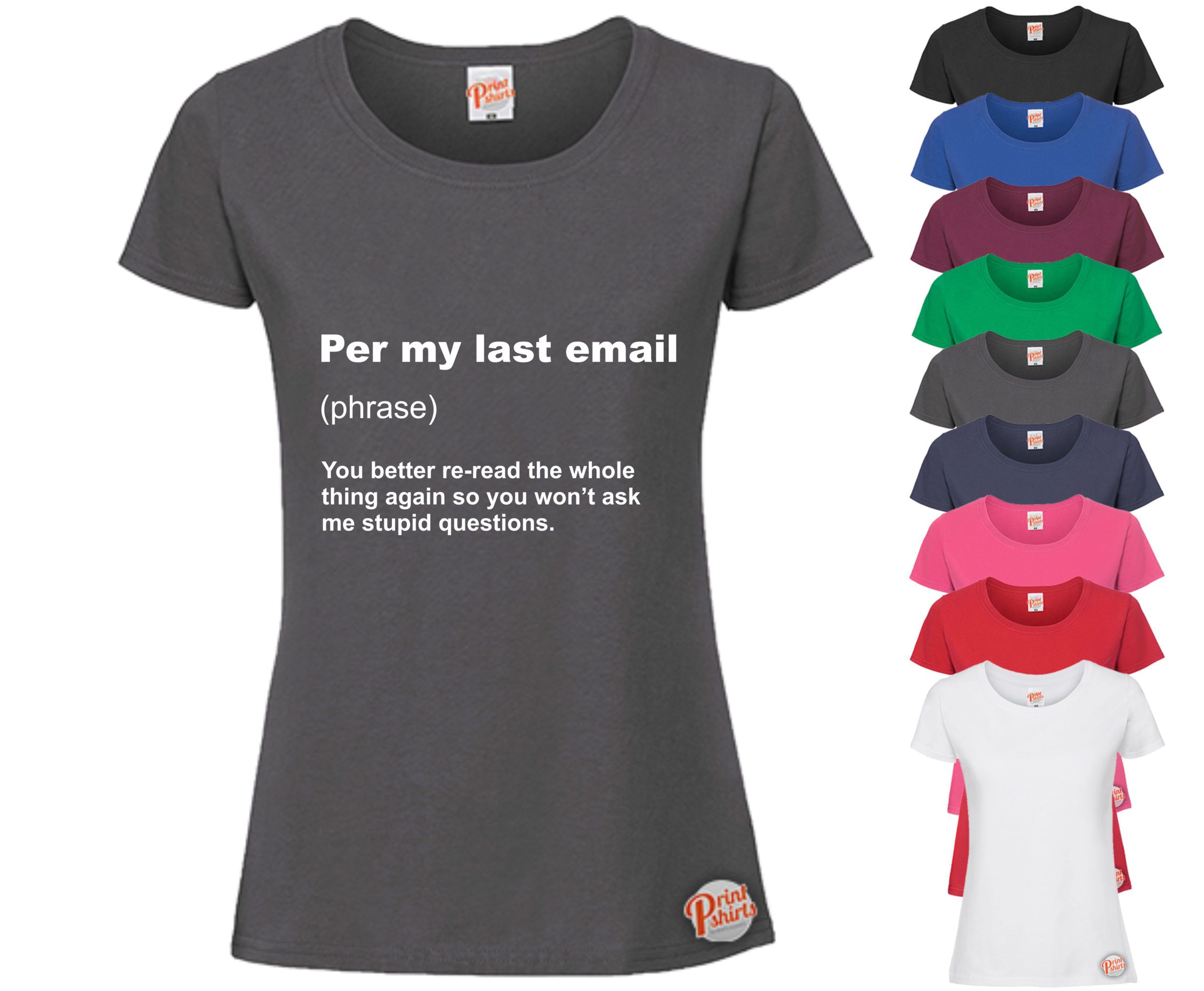 (Ladies) Per my last email! Take a look at this funny T-Shirt ideal for girls with a great sense of humour! Put on this hilarious and humorous printed top and let the good times roll! T-shirts for all women. A cheap and affordable price! Perfect for people of all ages. Available in multiple colours. Available in all years. Crack an silly joke or two, be greeted with mischievous giggles in a tee to match! Whether it’s at a family gathering, lunchtime at work, or just down the local pub with the lads, this tummy tickling styled top is bound to make people laugh out loud uncontrollably! Get your, “(Ladies) Per my last email!” Printed t-shirt now!