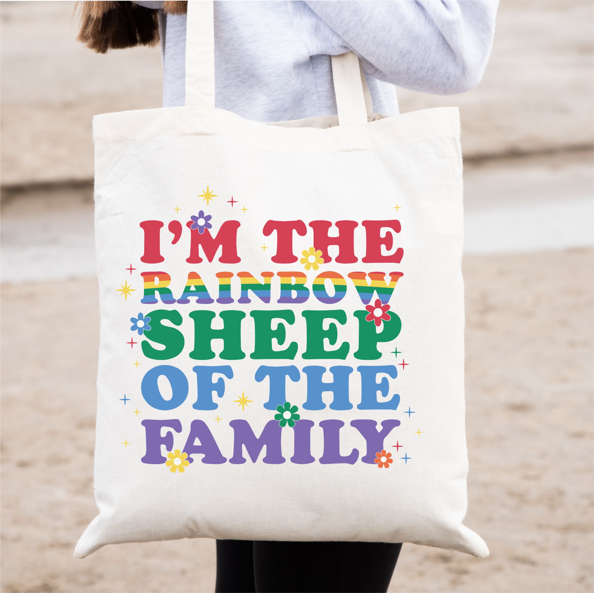 Rainbow Sheep of the Family Tote Bag – Colorful Pride Canvas Shopper with Retro Lettering & Flower Power Design