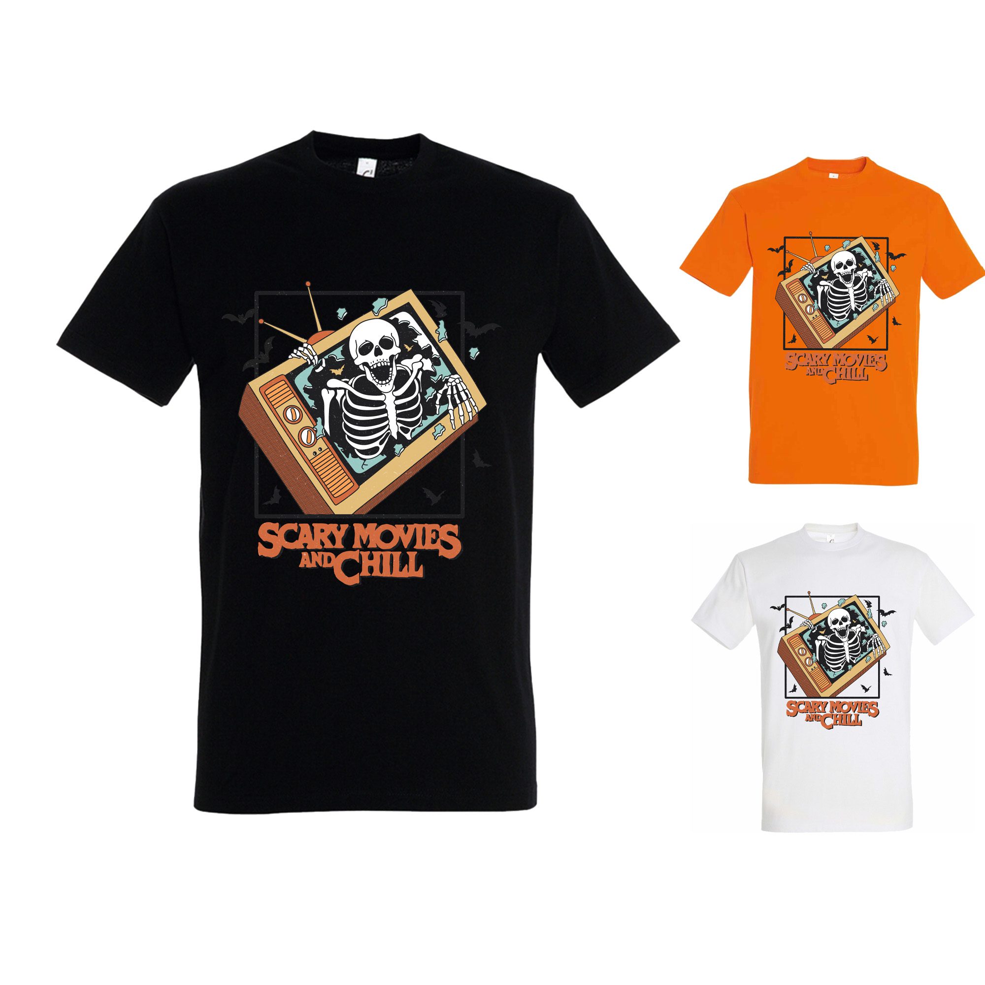 Scary Movies and Chill Skeleton Halloween T-Shirt is the ultimate mix of creepy and funny. Featuring a bold middle finger skull graphic with stars, creepy bones, and gothic horror styling, this tee brings serious attitude to your Halloween wardrobe. It’s the kind of shirt that makes people laugh, double-take, and ask where you got it.
