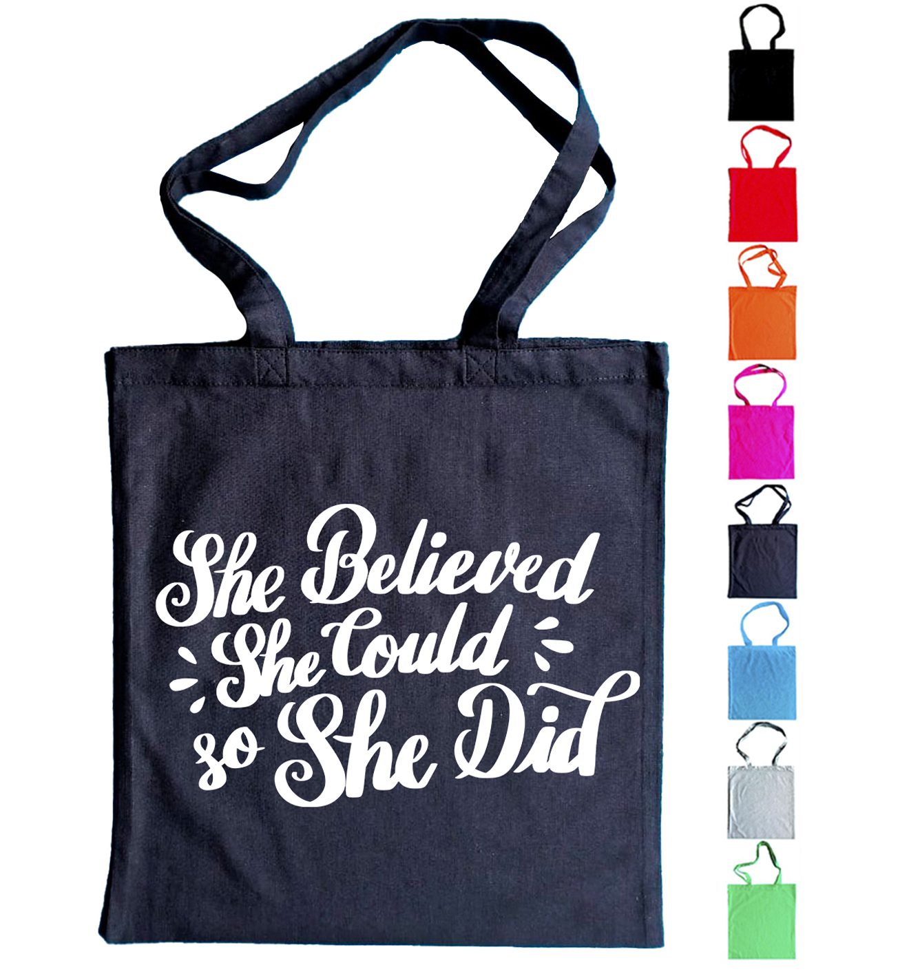She Believed – Tote Bag from PrintShirts! Sold at an extremely cheap price, made to an extraordinary high quality level! Ideal if you want to spread some positivity to those around you. Put a smile on your friends and families face when they see you sporting this tote bag. These Tote bags are ideal for those of you who need a space to carry all your worldly possessions in. We have awesome designs here so you look trendy whilst doing it. The Tote bags on offer are extreme value for money. It is rare that you can get such cool accessories for such a cheap price. These are ideal to buy as gifts for your close one at special occasions, why not buy multiple so you and yours can match? Don’t wait around, get your She Believed – Tote Bag now!