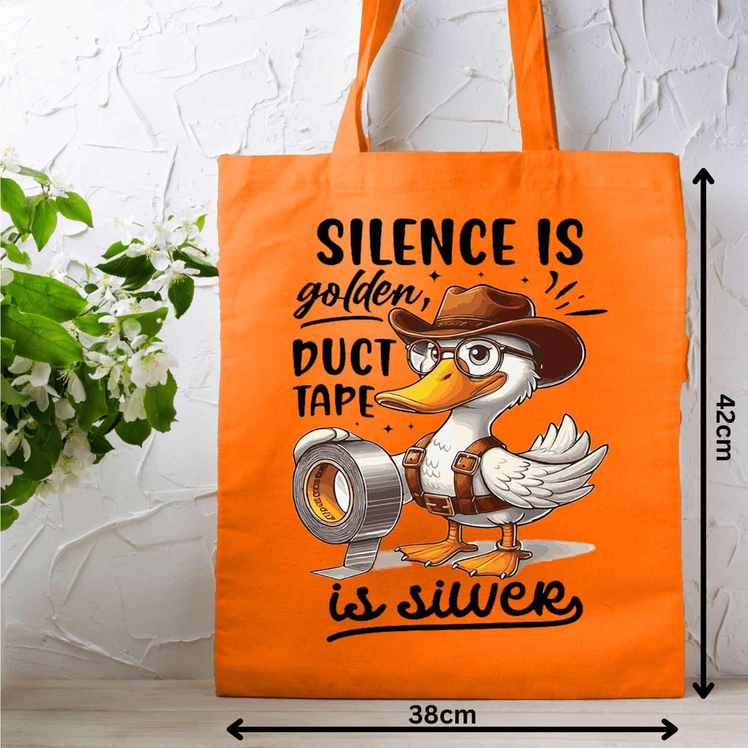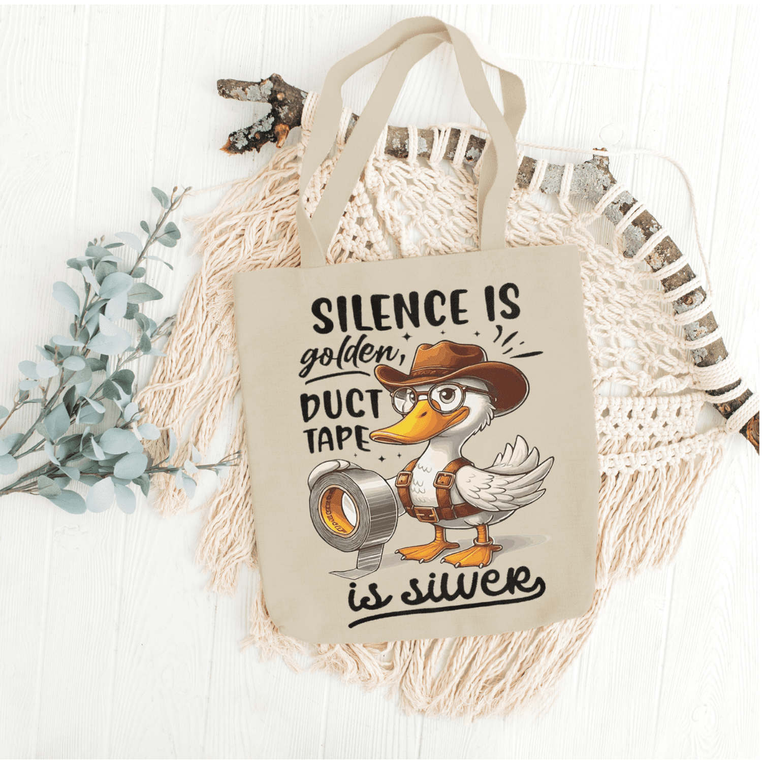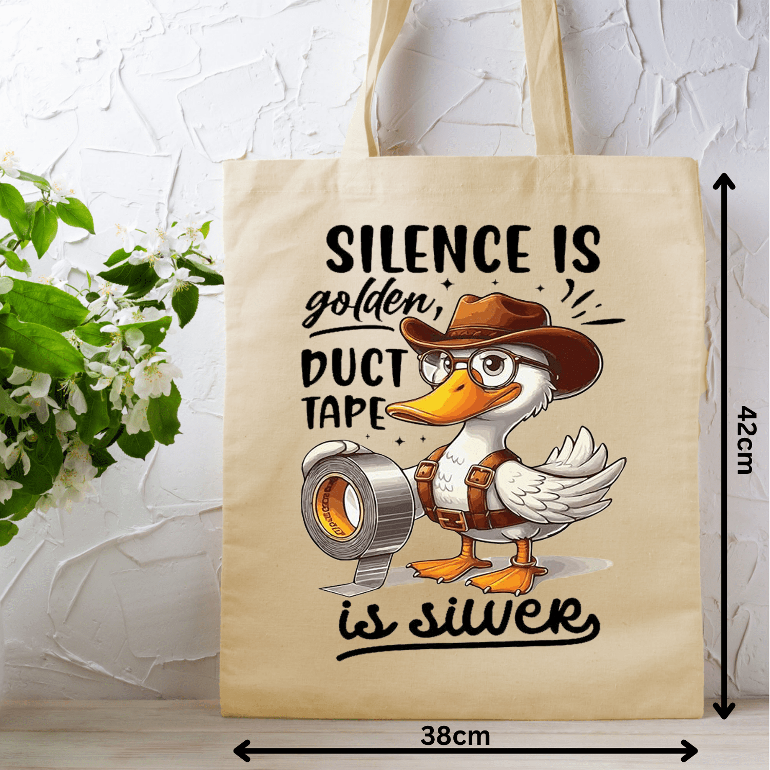 Silence Is Golden Duct Tape Is Silver Tote Bag – Funny Duck Cartoon Graphic Bag for Summer, Beach, Work, School, Shopping & Everyday Use dependable everyday tote that lasts well beyond one outing. The bold animal artwork stands out, the cotton build is lightweight yet sturdy, and it folds flat into a drawer, glove box or hallway basket until the next adventure.